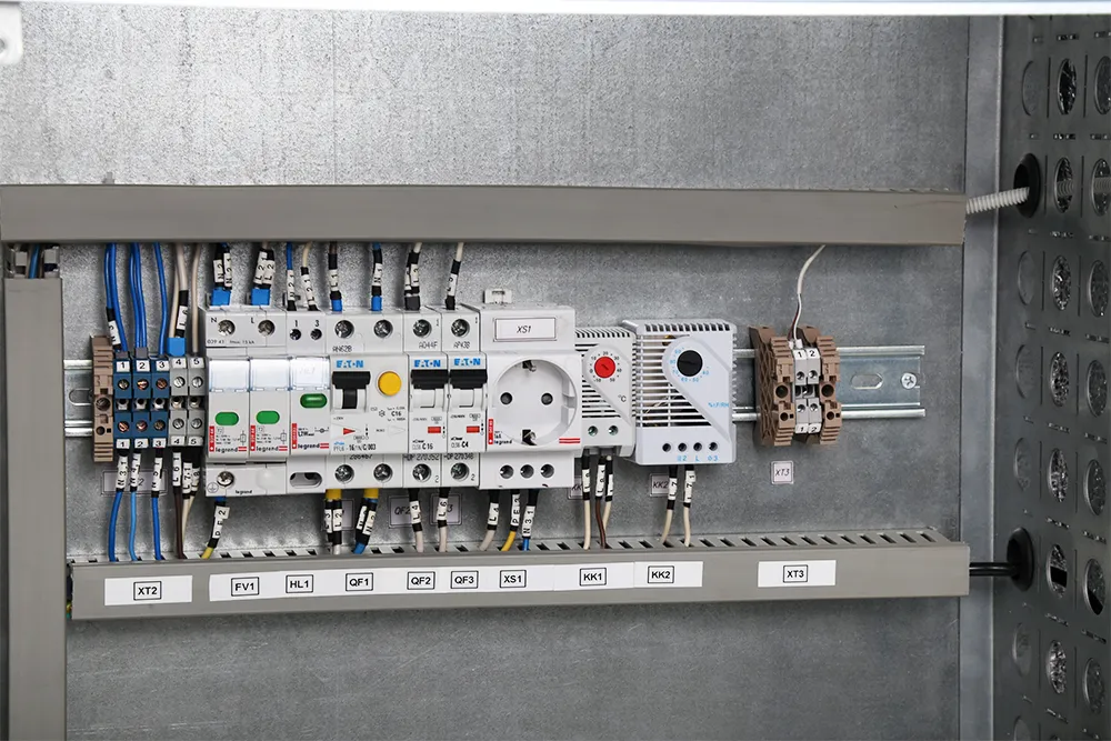 В шкафу находятся датчик открытия дверей для подключения искусственного освещения или сигнализации, а также розетка для технологических нужд 220 В на максимальный ток 16 А, подключенная через дифференциальный автомат с током утечки 30 мА. Для защиты оборудования от скачков напряжения, вызванных грозовыми разрядами или переходными процессами в питающей сети, шкаф оснащен ограничителем перенапряжения, предназначенным для защиты как кабельных, так и воздушных линий ввода. Контроль состояния ограничителя перенапряжения осуществляется визуально, по цвету флажка разрядника, в случае его износа производится замена варисторной вставки без покупки нового узла в сборе. Для защиты оборудования от перенапряжения, токов короткого замыкания и токов утечки используются автоматические и дифференциальные выключатели, установленные на DIN-рейку. Системы питания климатического контроля и оборудования потребителя коммутируются через разные автоматические выключатели. Селективность защиты позволяет отключить поврежденный участок от питания, тем самым обеспечивая непрерывную работу остального оборудования.